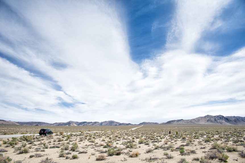 Nous avons roulé plus loin pour faire le plein d’essence à Beatty, une ville (pas fantôme cette fois) toujours dans le Nevada. Bim ! Bienvenue dans l’Amérique profonde. Les deux caissières de la station d’essence étaient de parfaites caricatures : obèses, édentées, un accent à couper au couteau, les cheveux bien crado (un mix entre les sœurs de Marge, Celtus et Jeff, le vendeur de BD, vous voyez ?). Nous cherchions en vain quelque chose de sain à manger pour le petit-déjeuner dans leur petite épicerie. A l’évidence, ce n’est pas sur les routes que l’on mange le mieux.