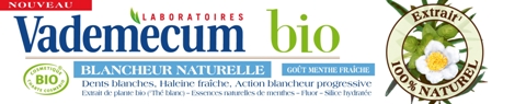 En théorie : Les experts des laboratoires Vademecum, ont développé le premier dentifrice Vademecum bio pour redonner aux dents leur blancheur naturelle. Grâce à sa formule exclusive enrichie en extrait de thé blanc bio et en silice hydratée, Vademecum bio Blancheur Naturelle, offre une blancheur naturelle tout en préservant l´émail. Enrichi en fluor, il assure une bonne hygiène bucco-dentaire.