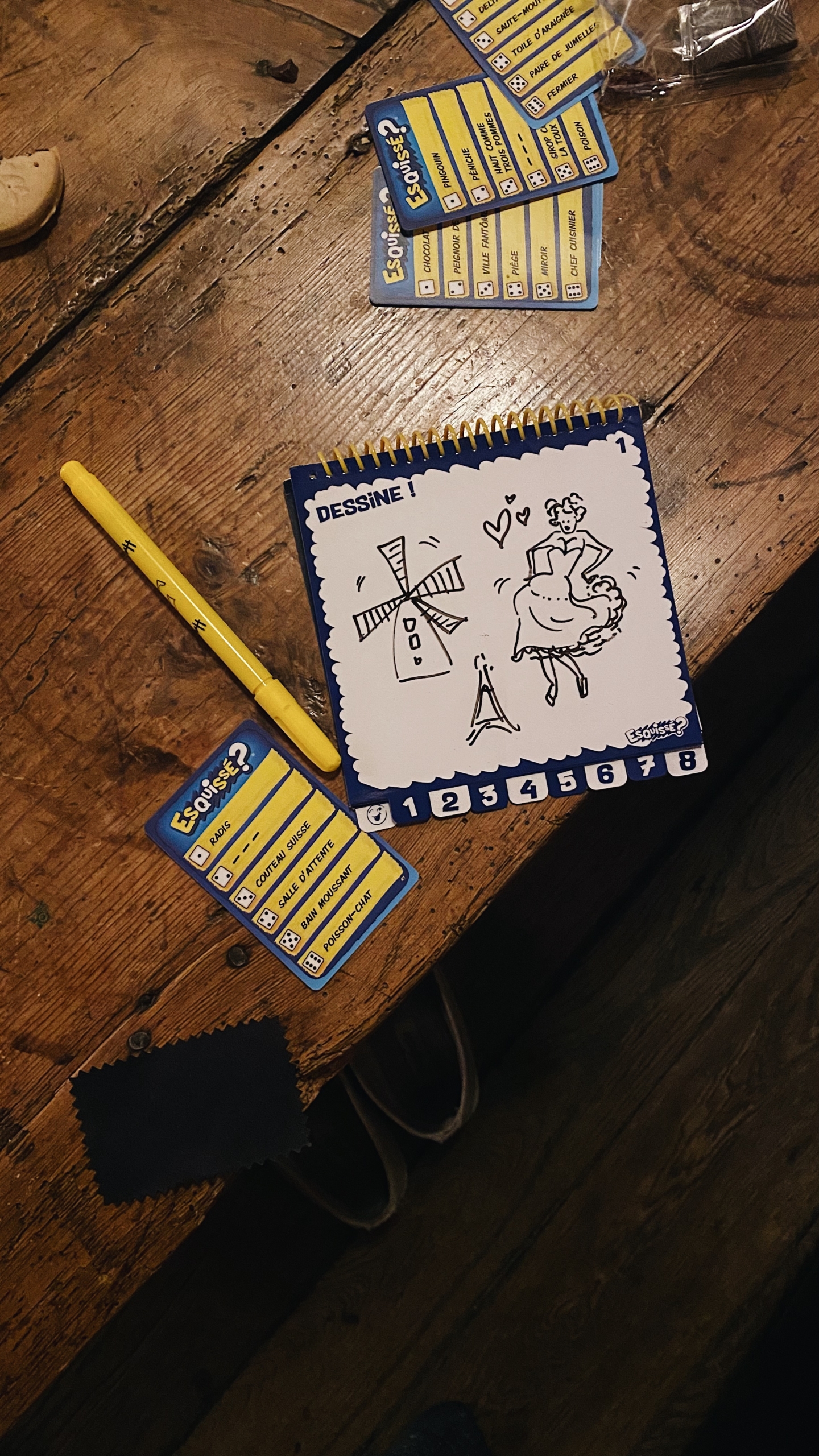 1. Esquissé : j’adore ce jeu parce qu’il ne nécessite pas d’être meilleur que les autres pour gagner ! Le but ? Faire deviner un mot ou une expression grâce à ses compétences en dessin et c’est vraiment beaucoup plus drôle quand on ne sait pas dessiner. On fait circuler les carnets autour de la table et d’interprétation en interprétation, on découvre souvent à la fin un résultat qui n’a rien à voir avec le brief de départ. C’est hilarant.