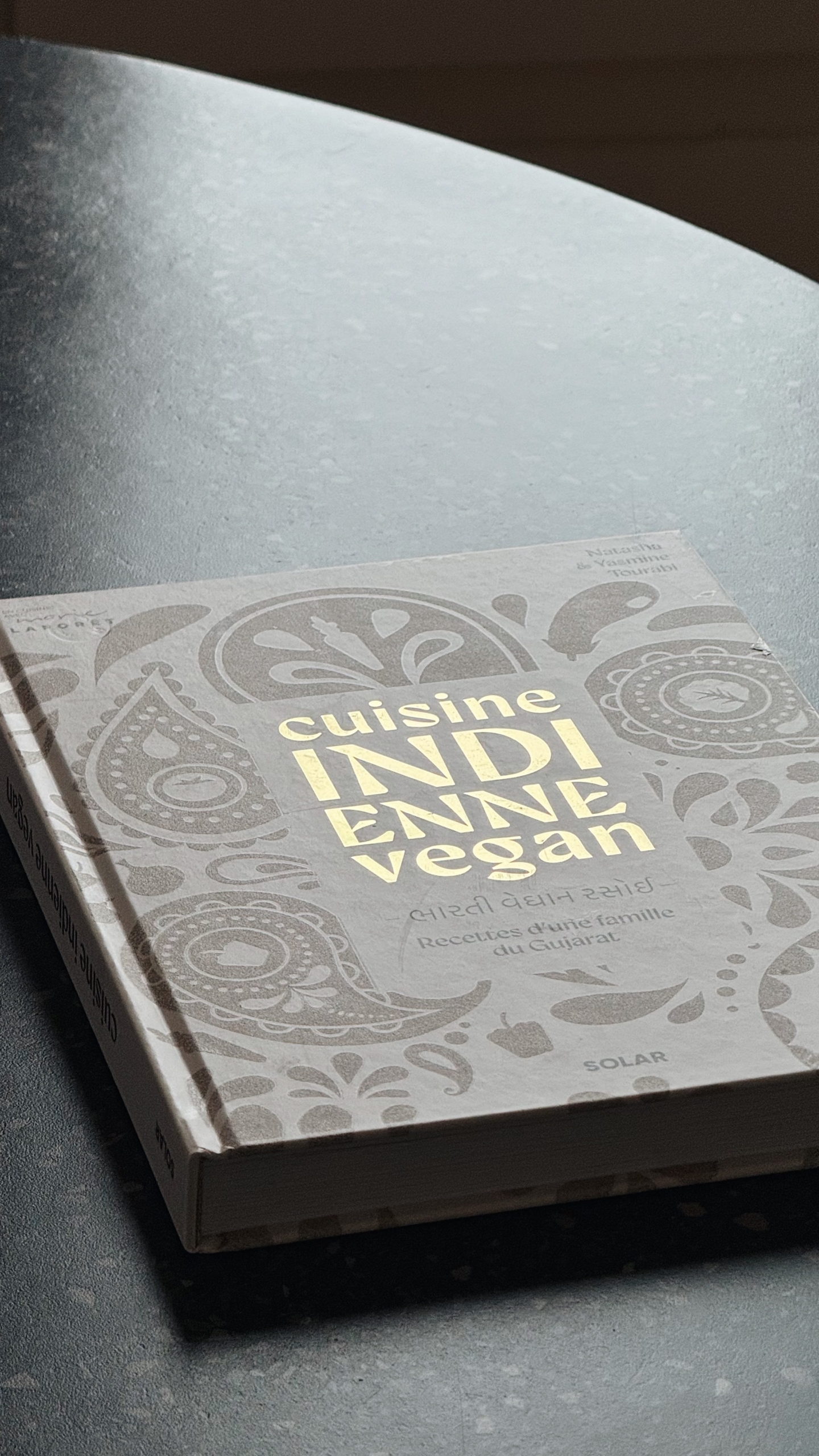 2. Cuisine indienne vegan* : c’est un recueil de recettes du Gujarat végétalisées par Natasha et sa maman, dont l’intention est de conserver et transmettre les savoirs culinaires et culturels de leur famille. Au-delà d’être le meilleur livre de cuisine indienne que je possède, c’est un héritage précieux qui me touche particulièrement – je l’ai d’ailleurs déjà offert à Noël à des personnes qui, comme moi, sont très attachées aux saveurs familiales. On y trouve 75 recettes pour cuisiner légumes, légumineuses, fritures, pains, plats, condiments, desserts et boissons. Mes papilles palpitent pour le Shaak de petits pois au lait de coco et les naans – on me demande systématiquement la recette quand j’en prépare, ça veut dire ce que ça veut dire.