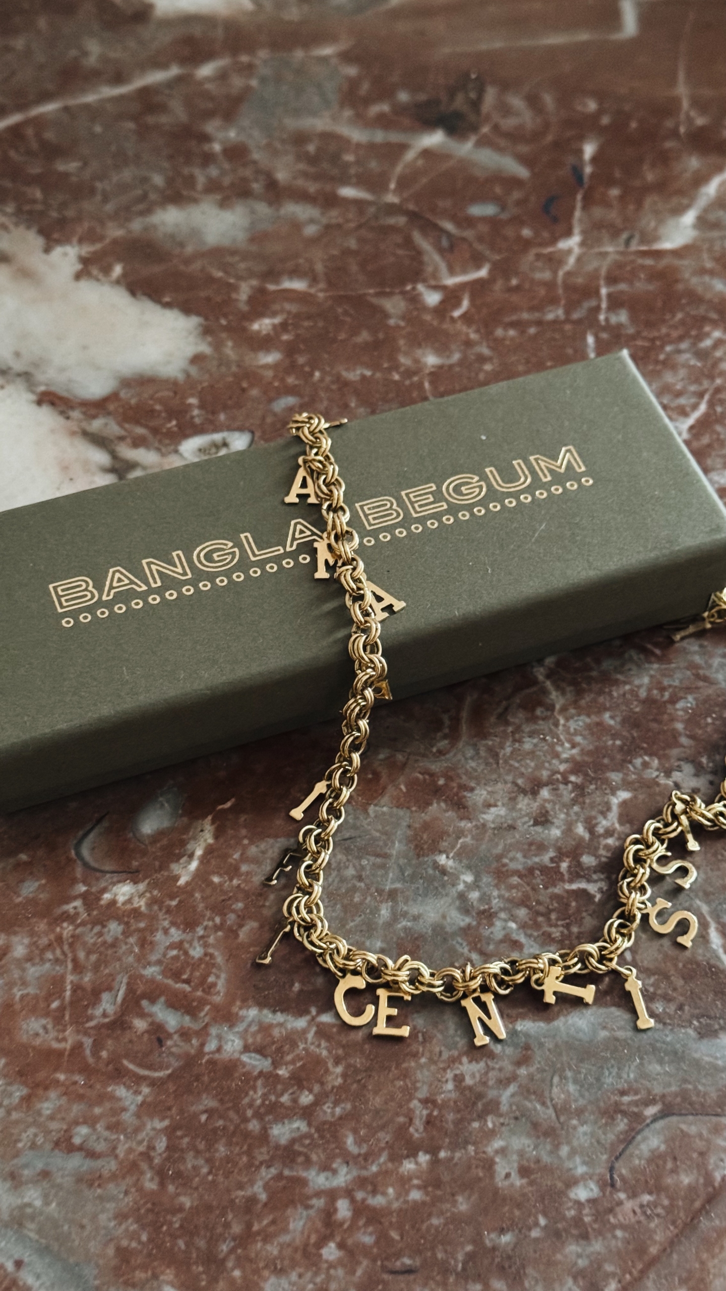2. Un collier de Mot Compliqué Bangla Begum : archi fan des créations de cette marque française, en particulier de sa collection de colliers de mots compliqués que j’ai découverte grâce à mon amie Alice. Différents mots de différentes langues sont transformés en colliers intemporels et poétiques. J’ai évidemment choisi le mot italien : sovramagnificentissimamente. Il voudrait dire « d’une manière qui est de loin plus que magnifique » et aurait été utilisé par Dante dans la Divine Comédie – la vérité c’est que personne à part lui n’a jamais dû utiliser ce terme mais osef ; il intrigue, il fait sourire, il déclenche toujours une conversation.