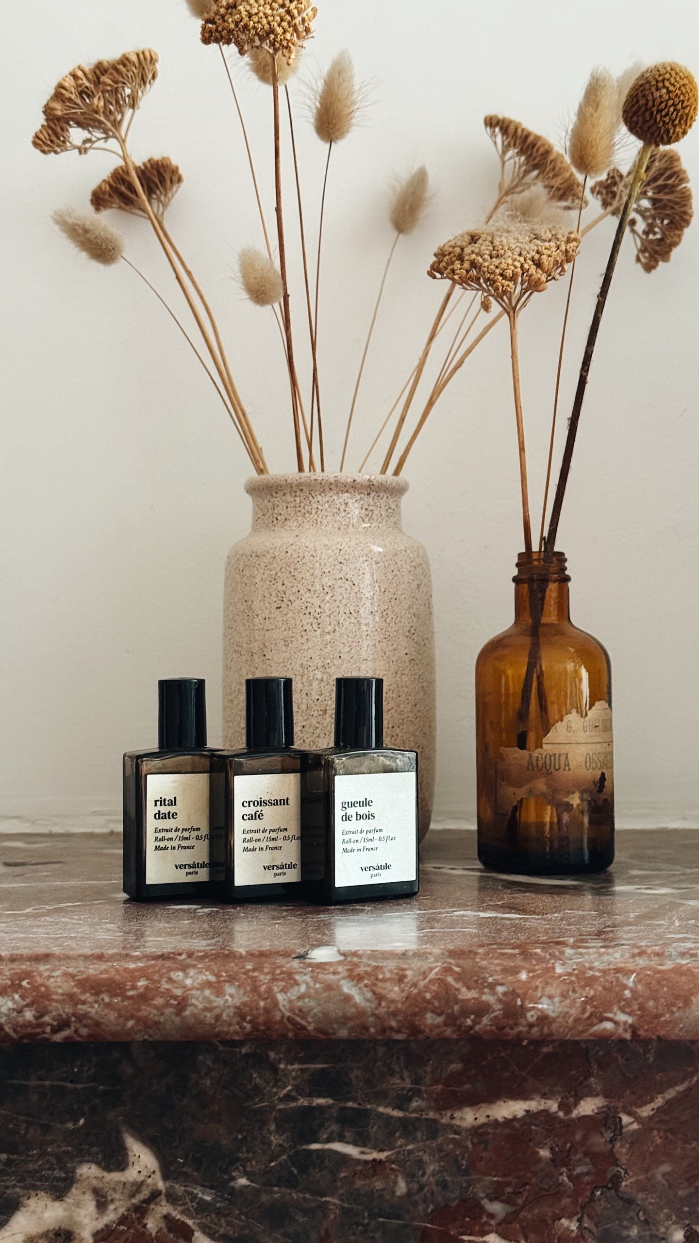 6. Un parfum Versatile : j’ai découvert la marque grâce à mon amie Alice à qui j’ai demandé un jour par quelle sorcellerie elle sentait aussi bon. Elle a sorti de son sac un petit flacon où l’on lisait croissant café et j’ai fini par acheter le même une fois qu’elle a quitté Paris. Versatile propose des parfums mixtes, naturels et fabriqués en France qui tiennent relativement bien, aux odeurs abouties, complexes et équilibrées. Mes favoris : croissant café donc, gueule de bois et rital date – le parfum de mon amoureux.